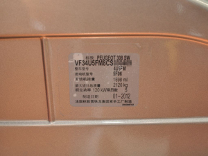 标致308SW 2012款 SW 1.6T AT时尚型 (车辆铭牌)
